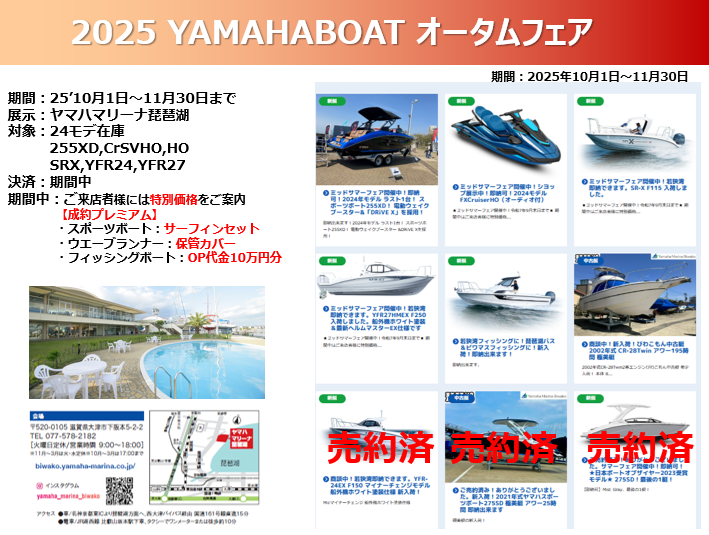 - 【お得な情報】オータムフェア開催中!ヤマハスポーツボート、フィッシングボートをお買い得価格にて販売致します。