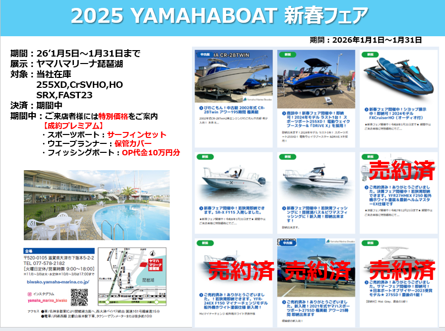 - 明けましておめでとうございます!本年もどうぞ宜しくお願い致します。【お得な情報】新春フェア開催中!ヤマハスポーツボート、フィッシングボートをお買い得価格にて販売致します。