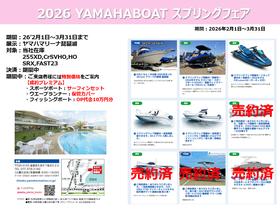 - 【ボートお得な情報】スプリングフェア開催中!ヤマハスポーツボート、フィッシングボートをお買い得価格にて販売致します。