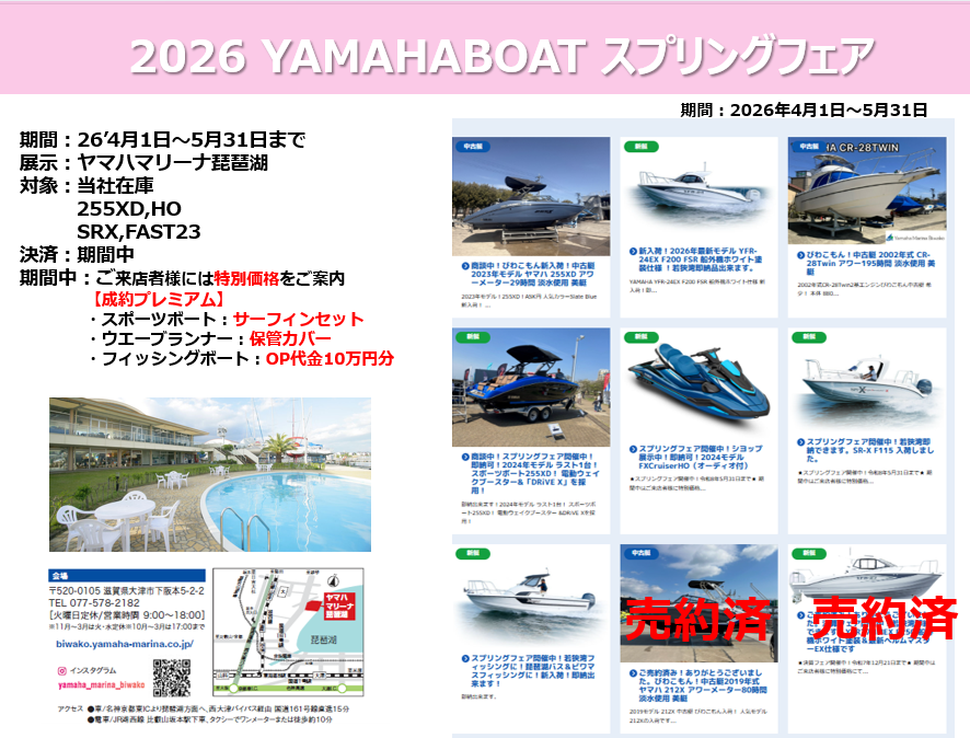 ヤマハマリーナ琵琶湖ブログ 【ボートお得な情報】スプリングフェア開催中!ヤマハスポーツボート、フィッシングボートをお買い得価格にて販売致します。 2026/04/02(木) メールでのお問合せはこちら 前の記事へ 新着記事 2026/04/02 【ボートお得な情報】スプリングフェア開催中!ヤマハスポーツボート、フィッシングボートをお買い得価格にて販売致します。 2026/03/15 【お得なイベント】ヤマハシースタイルレンタルクラブ体験説明会inヤマハマリーナ琵琶湖 2026/02/01 【ボートお得な情報】スプリングフェア開催中!ヤマハスポーツボート、フィッシングボートをお買い得価格にて販売致します。 2026/01/26 【オーナー様へお知らせ】ボートヤード内、PWC(水上バイク)保管ラック建て替え工事中 2026/01/25 シーズン前の今がチャンス!2級ボート免許無料学科講習体験会実施3月21日22日 カテゴリ Information SHOP情報 スタッフレポート アーカイブ 月を選択... 2026年4月 2026年3月 2026年2月 2026年1月 2025年12月 2025年9月 2025年8月 2025年7月 2025年6月 2025年4月 2025年3月 2025年2月 2024年12月 2024年11月 2024年9月 2024年8月 2024年2月 2023年9月 2023年8月 2023年4月 2023年2月 2022年12月 2022年10月 2022年9月 2022年8月 2022年2月 2021年12月 2021年9月 2021年8月 2021年7月 2021年6月 2021年5月 2021年4月 2021年3月 2021年1月 2020年12月 2020年11月 2020年7月 2020年5月 2020年4月 2020年3月 2020年2月 2020年1月 キーワード検索
