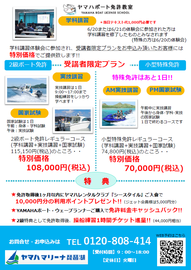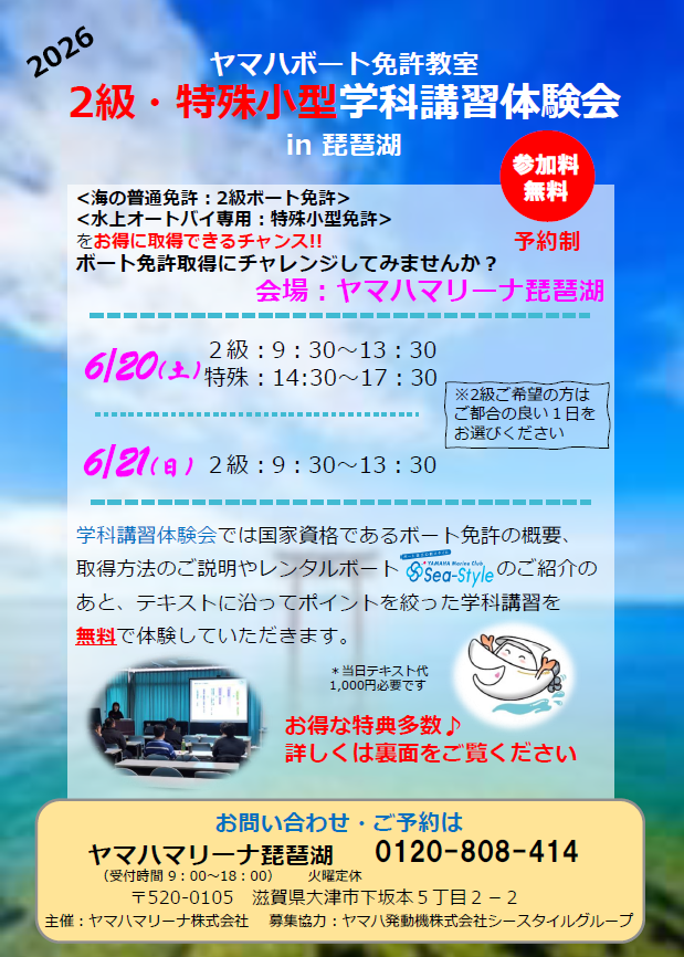 ヤマハマリーナ琵琶湖ブログ 【免許取得お得な情報】6月20日21日!2級・特殊小型ボート免許学科講習体験会を実施致します。 2026/04/20(月) 前の記事へ 新着記事 2026/04/20 【免許取得お得な情報】6月20日21日!2級・特殊小型ボート免許学科講習体験会を実施致します。 2026/04/02 【ボートお得な情報】スプリングフェア開催中!ヤマハスポーツボート、フィッシングボートをお買い得価格にて販売致します。 2026/03/15 【お得なイベント】ヤマハシースタイルレンタルクラブ体験説明会inヤマハマリーナ琵琶湖 2026/02/01 【ボートお得な情報】スプリングフェア開催中!ヤマハスポーツボート、フィッシングボートをお買い得価格にて販売致します。 2026/01/26 【オーナー様へお知らせ】ボートヤード内、PWC(水上バイク)保管ラック建て替え工事中 カテゴリ Information SHOP情報 スタッフレポート アーカイブ 月を選択... 2026年4月 2026年3月 2026年2月 2026年1月 2025年12月 2025年9月 2025年8月 2025年7月 2025年6月 2025年4月 2025年3月 2025年2月 2024年12月 2024年11月 2024年9月 2024年8月 2024年2月 2023年9月 2023年8月 2023年4月 2023年2月 2022年12月 2022年10月 2022年9月 2022年8月 2022年2月 2021年12月 2021年9月 2021年8月 2021年7月 2021年6月 2021年5月 2021年4月 2021年3月 2021年1月 2020年12月 2020年11月 2020年7月 2020年5月 2020年4月 2020年3月 2020年2月 2020年1月 キーワード検索